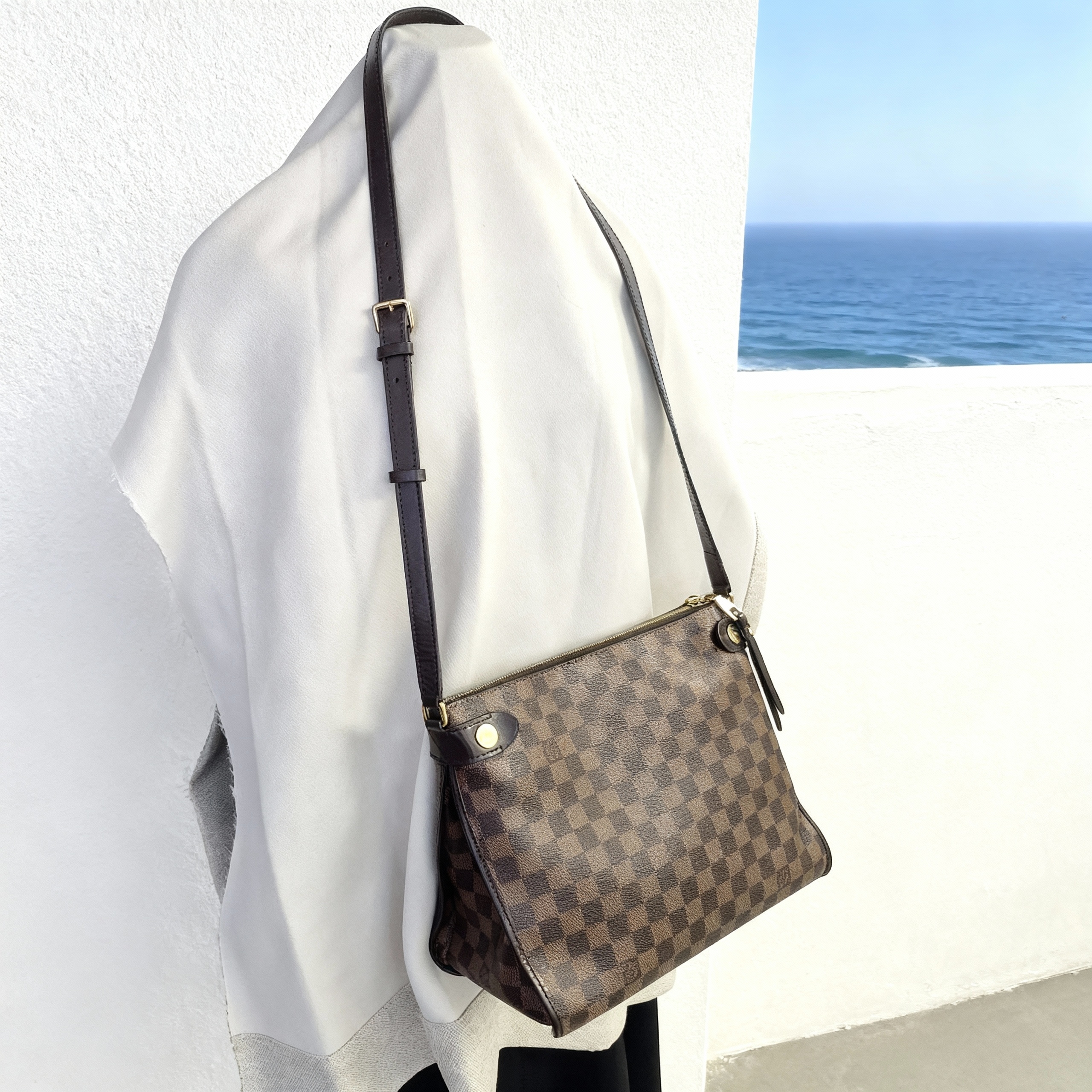 ルイヴィトンの定番ラインであるダミエが施されたショルダーバッグ☆ マチに加えてオープンポケットもあるためしっかり収納が可能な一点です。