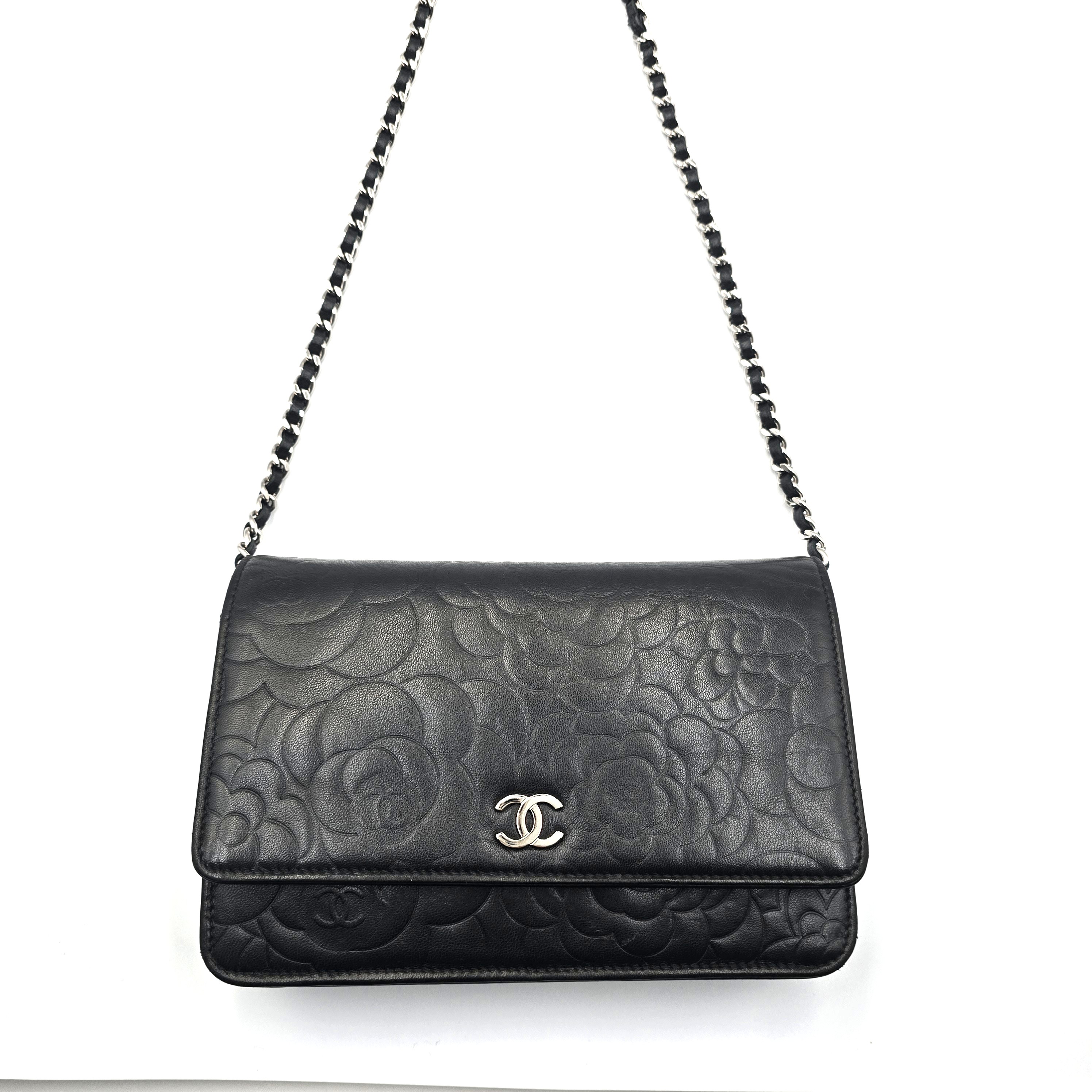 バッグと財布が一体化した便利なチェーンウォレット☆ ラムスキン素材でカメリアがプリントされ、パーティーシーンや、もちろん普段使いにもお使い頂ける別品です! 斜めがけが出来るバッグのようなチェーンタイプで、マチもありますので携帯電話等、収納出来ます♪