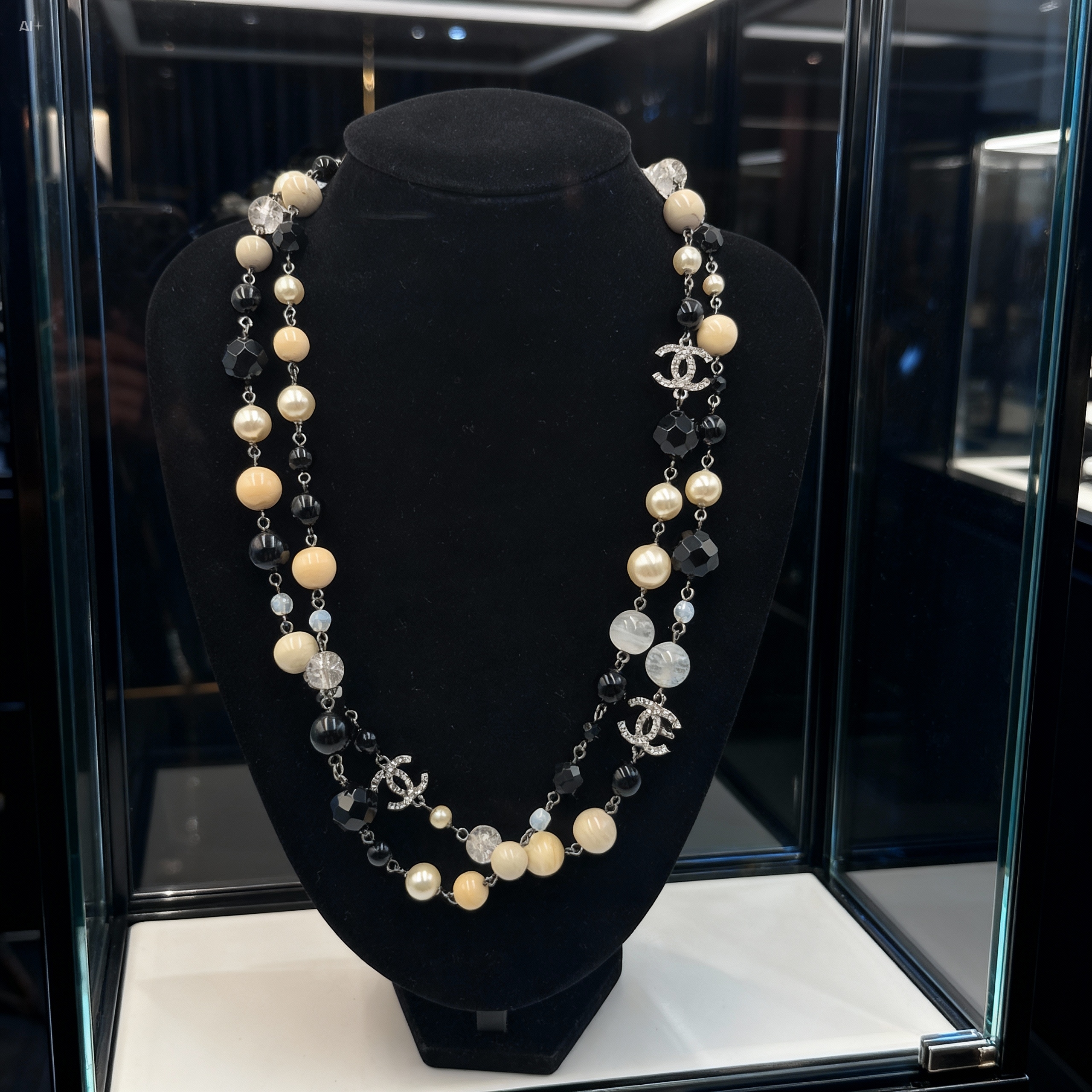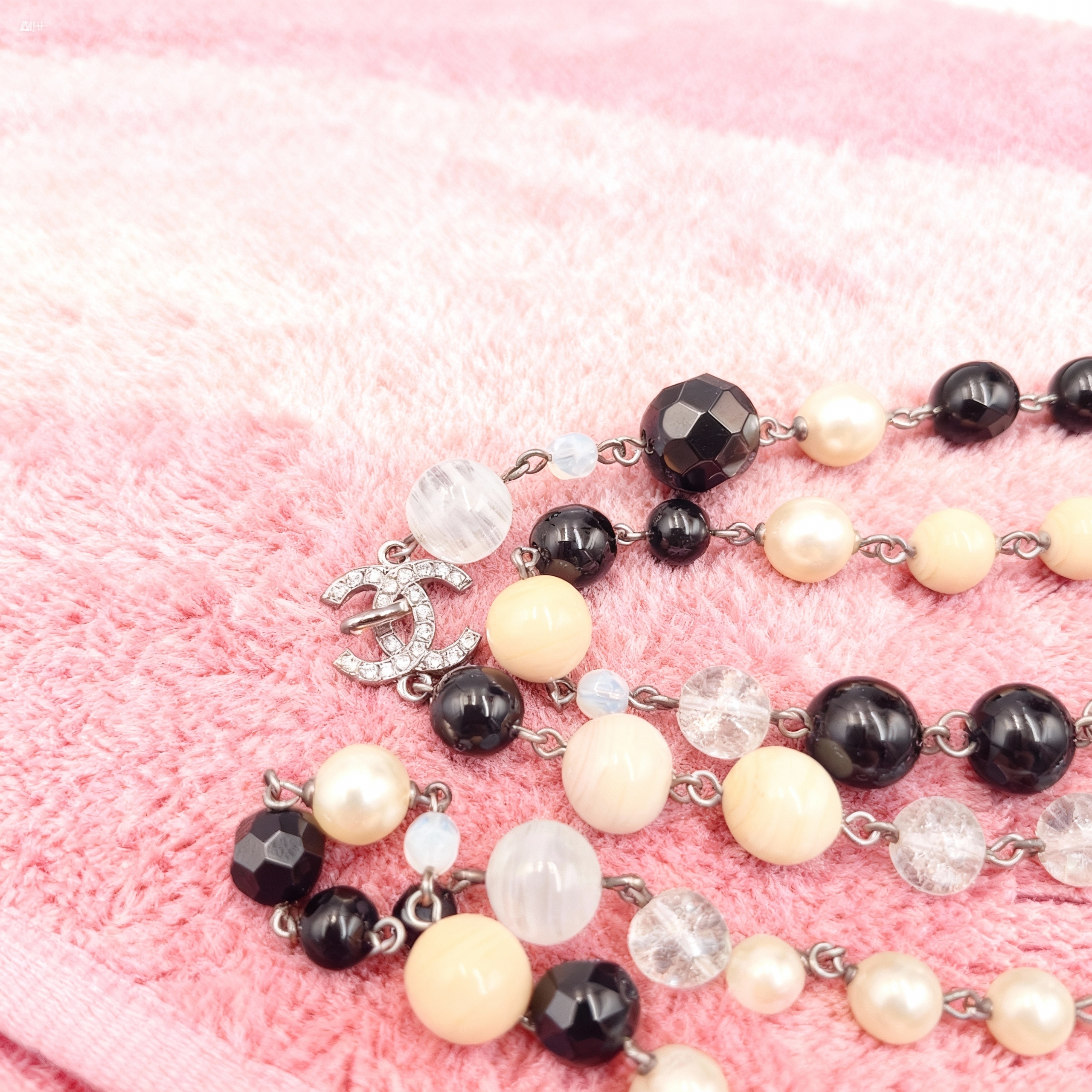 パールとココマークのロングネックレス☆ エレガントにもカジュアルにもはまる、シャネルらしいアイテムです! グッとセレブな印象になります♪ ブラックとアイボリーのビーズ、クリスタル、ココマークのチャームが付いたシャネルのロングネックレスです。 存在感あるデザインとシックな輝きで胸元をゴージャスに演出☆