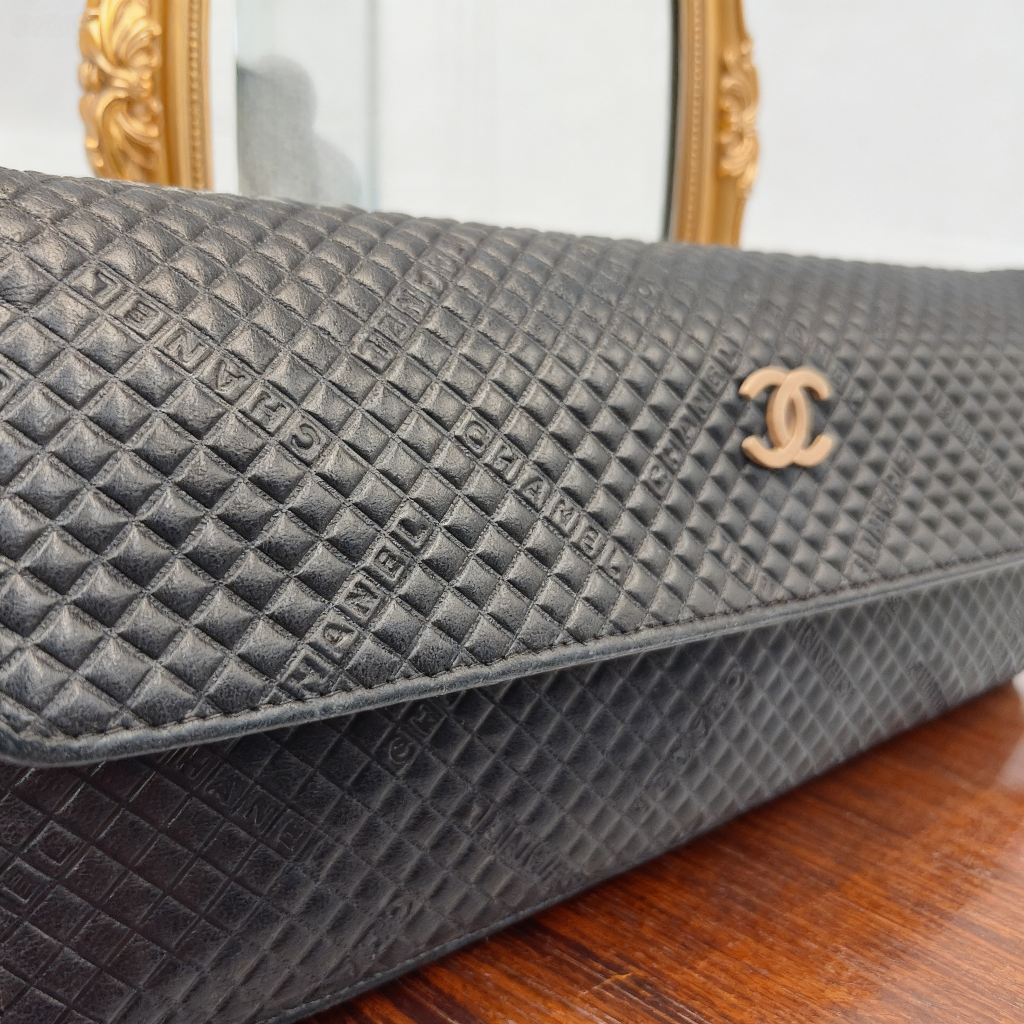バッグと財布が一体化した便利なチェーンウォレット☆ 全体に細かなロゴやキルティングのエンボス加工が施されています。 斜めがけが出来るバッグのようなチェーンタイプで、スマートフォンなどを収納できるスリムな形状が特徴です。