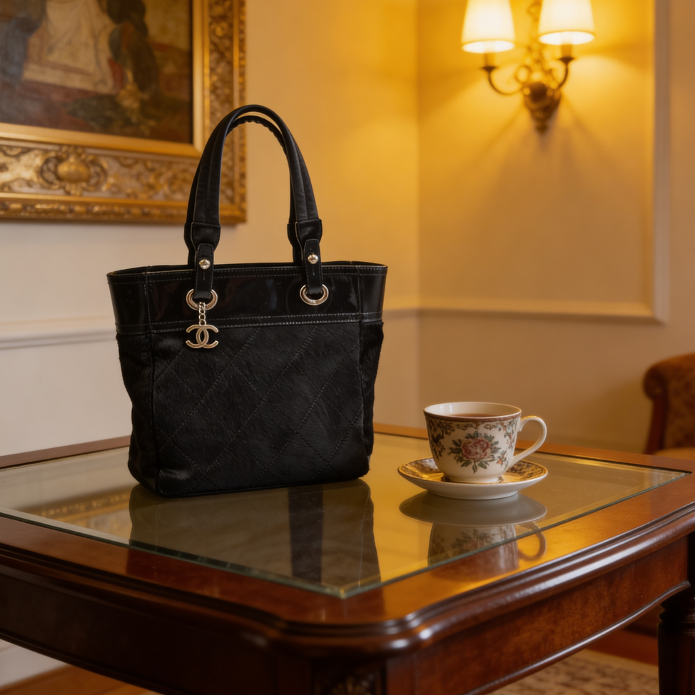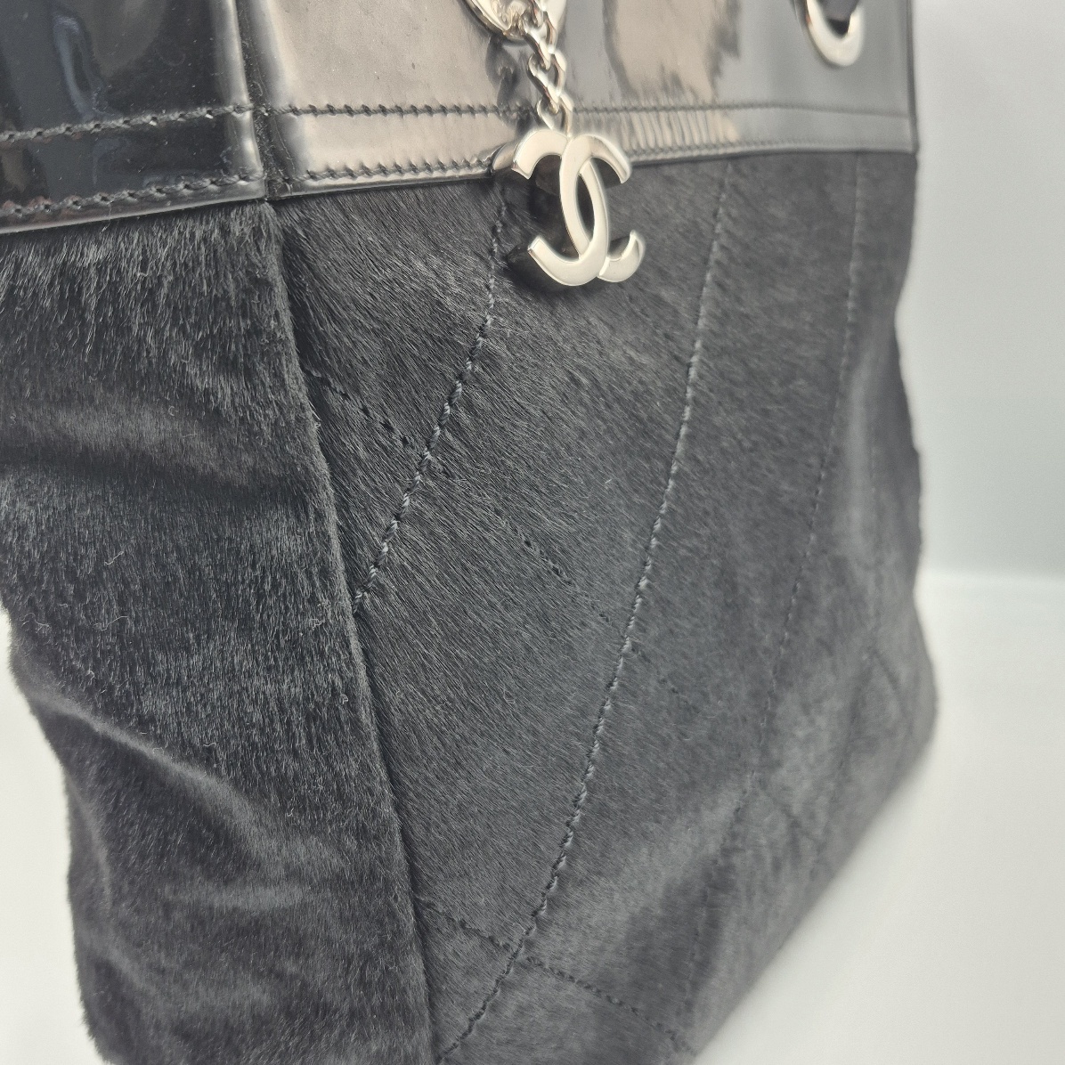 シャネル定番人気シリーズとなった「パリビアリッツ」♪ ダイヤモンドキルティングが施されたハラコ(毛皮)と光沢のあるパテントレザー(エナメル)を組み合わせた高級感のあるデザインが特徴です。 通勤や旅行など幅広く活用できる万能なアイテムです☆