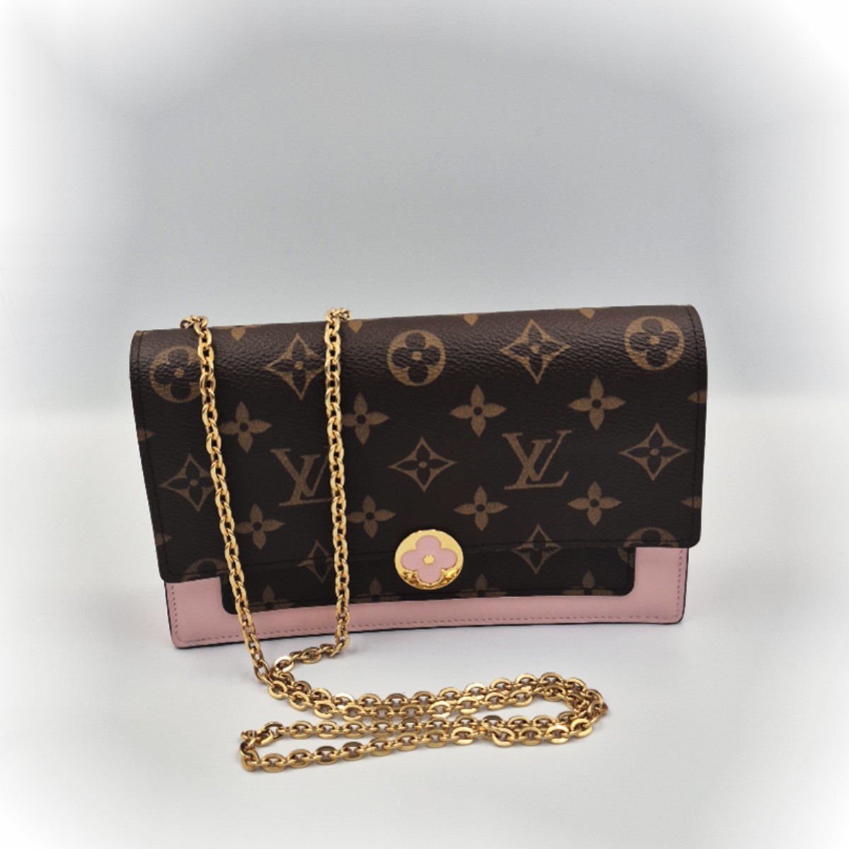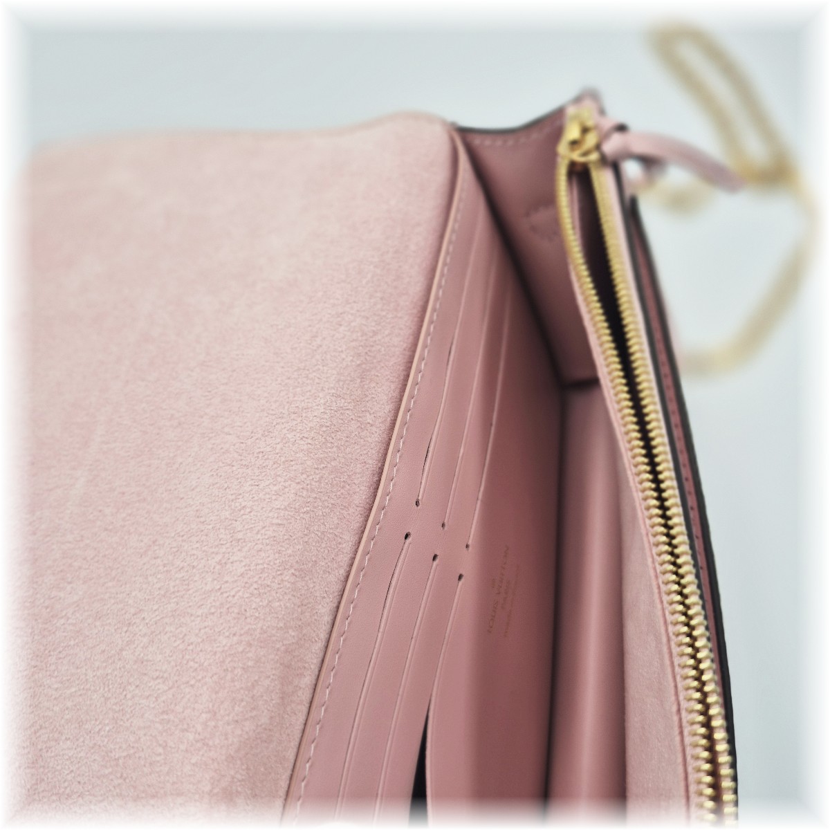 モノグラムキャンバスにローズバレリーヌの柔らかなピンクをアクセントにあしらった、チェーン付きウォレット。 バッグと財布が一体化した、便利なチェーンウォレットバッグ。 チェーンショルダーを外して、ウォレットとしてもご利用いただけます。