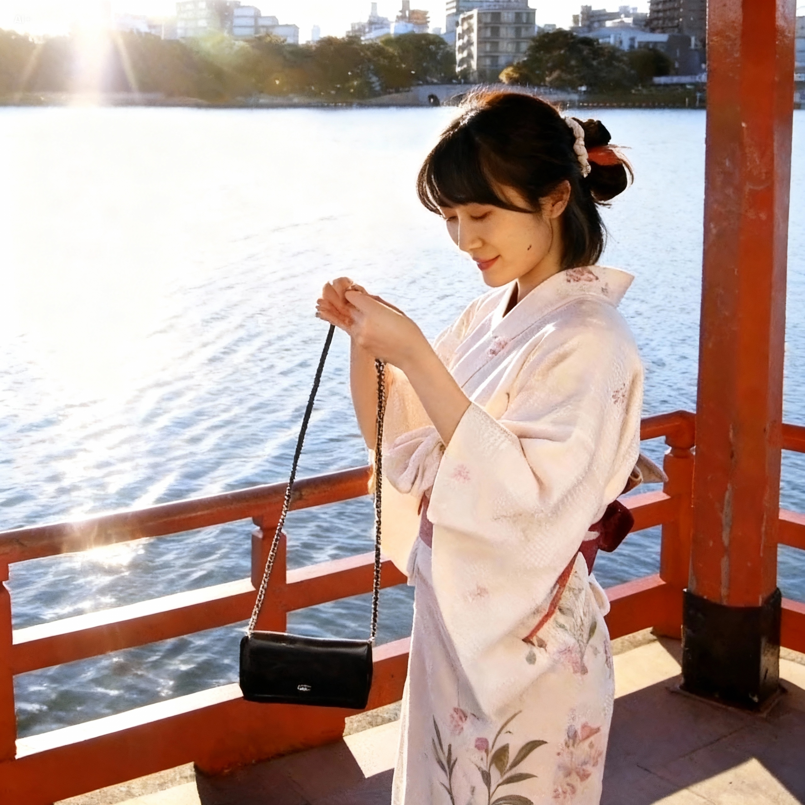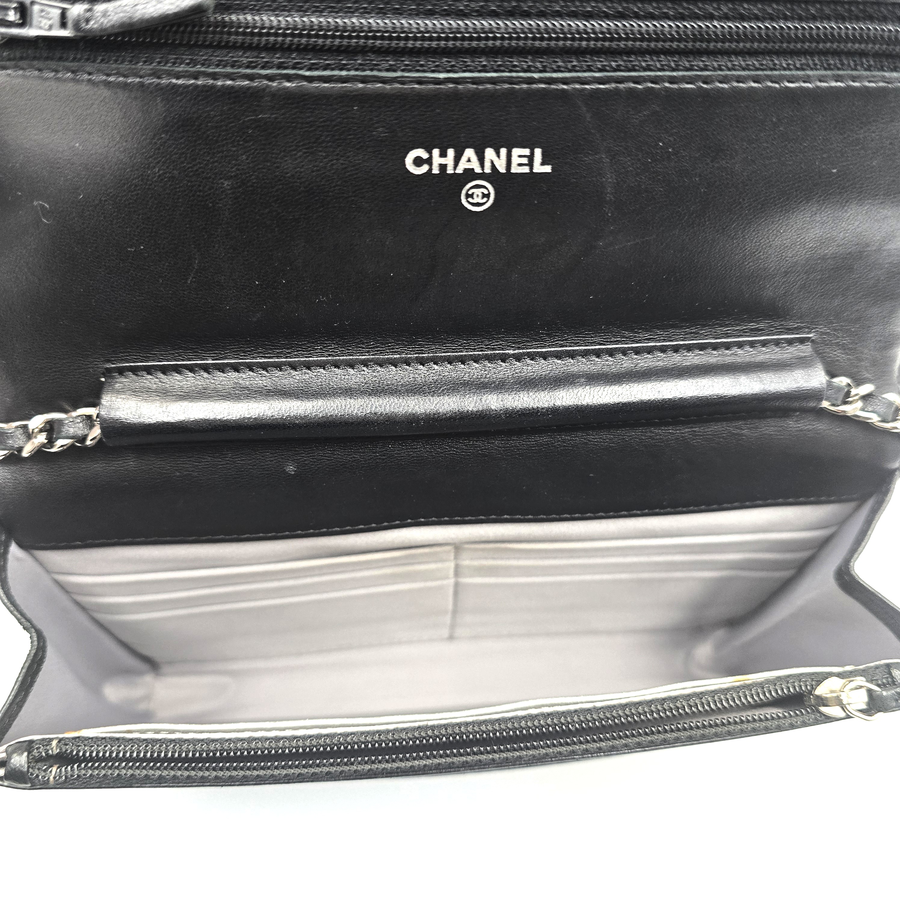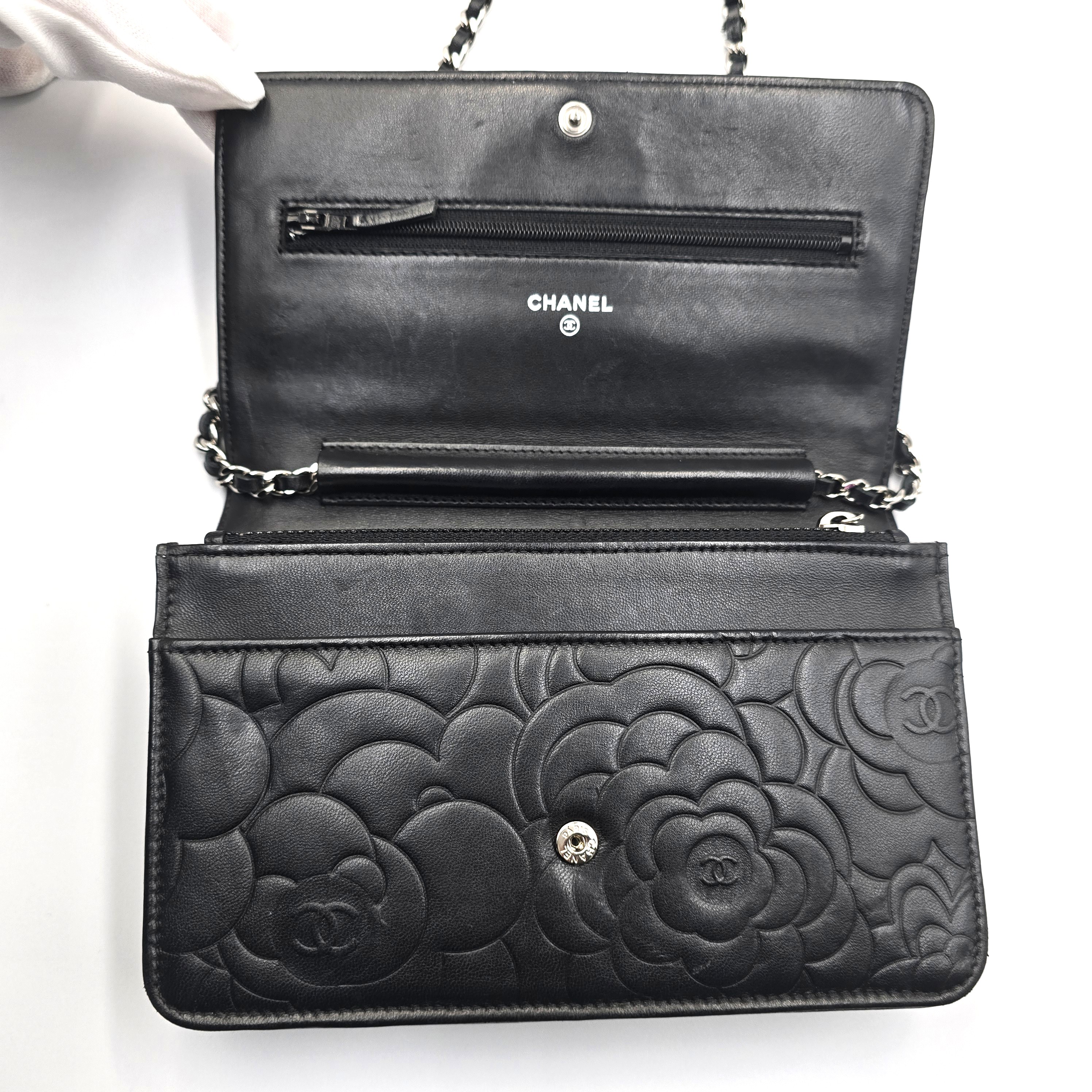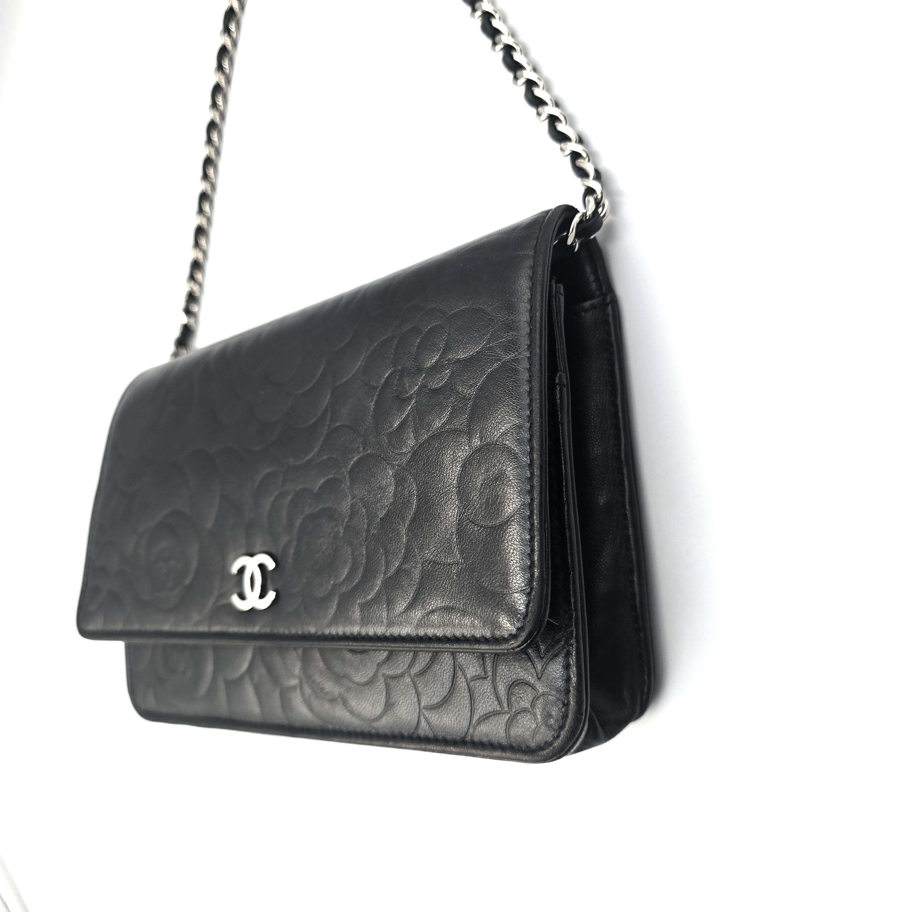 バッグと財布が一体化した便利なチェーンウォレット☆ ラムスキン素材でカメリアがプリントされ、パーティーシーンや、もちろん普段使いにもお使い頂ける別品です! 斜めがけが出来るバッグのようなチェーンタイプで、マチもありますので携帯電話等、収納出来ます♪