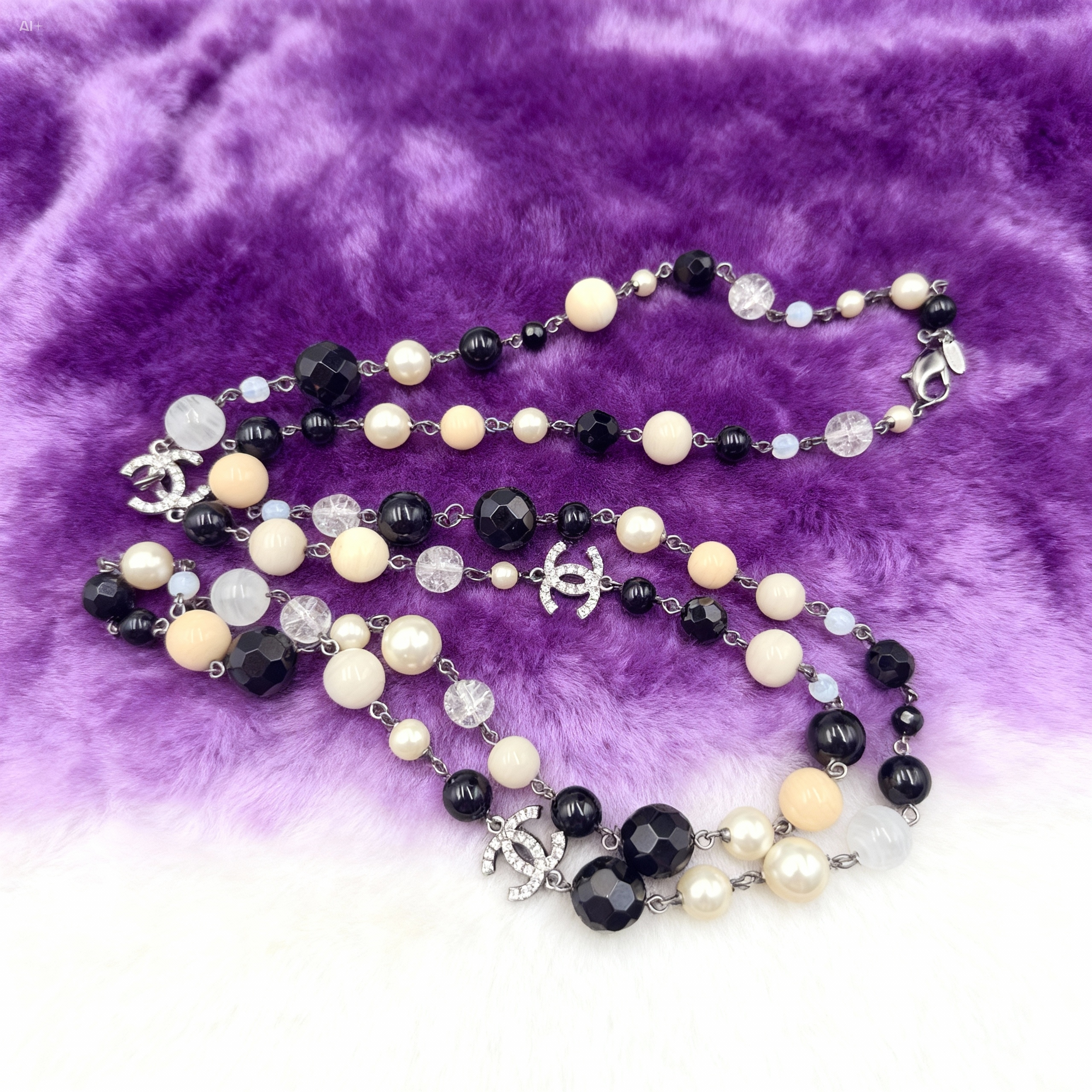 パールとココマークのロングネックレス☆ エレガントにもカジュアルにもはまる、シャネルらしいアイテムです! グッとセレブな印象になります♪ ブラックとアイボリーのビーズ、クリスタル、ココマークのチャームが付いたシャネルのロングネックレスです。 存在感あるデザインとシックな輝きで胸元をゴージャスに演出☆