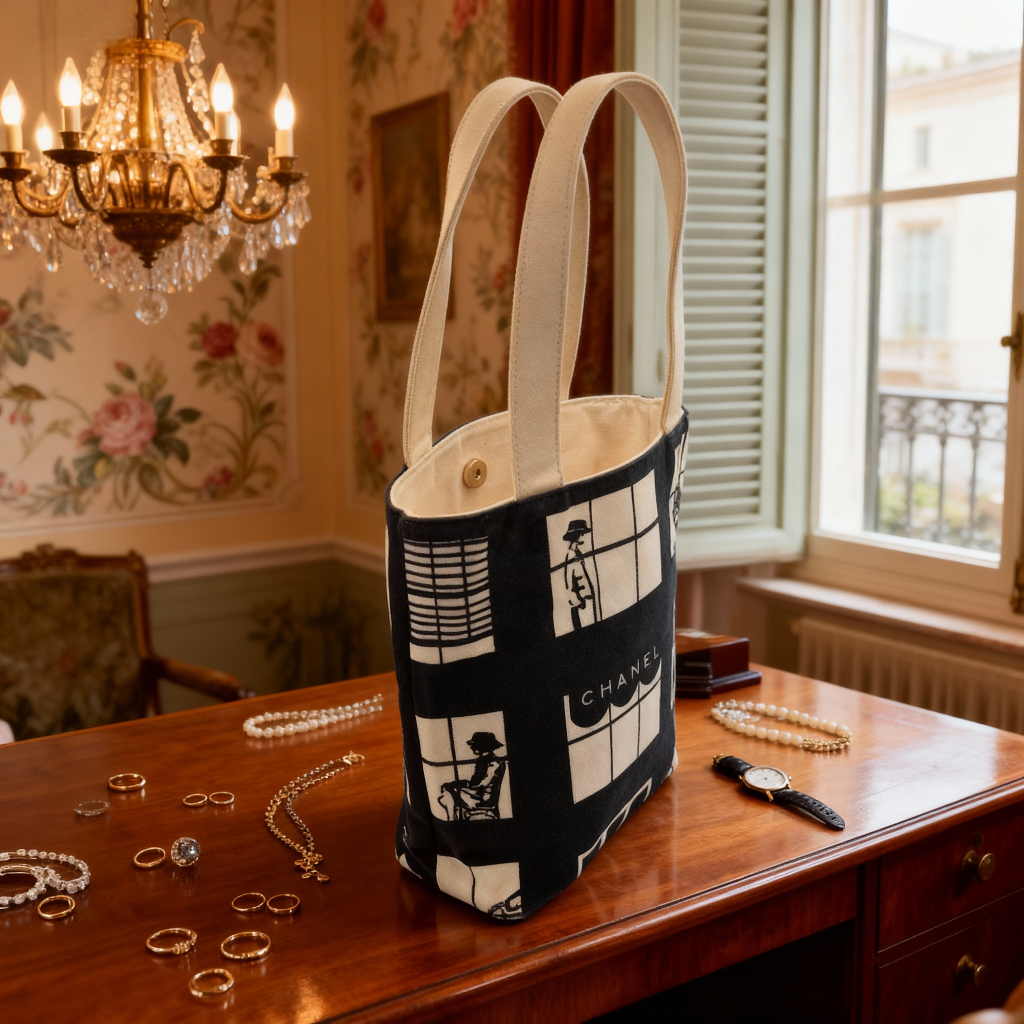 黒地に白の窓枠と、窓の中に女性(マドモアゼル)などのイラストが描かれた特徴的なデザインです。