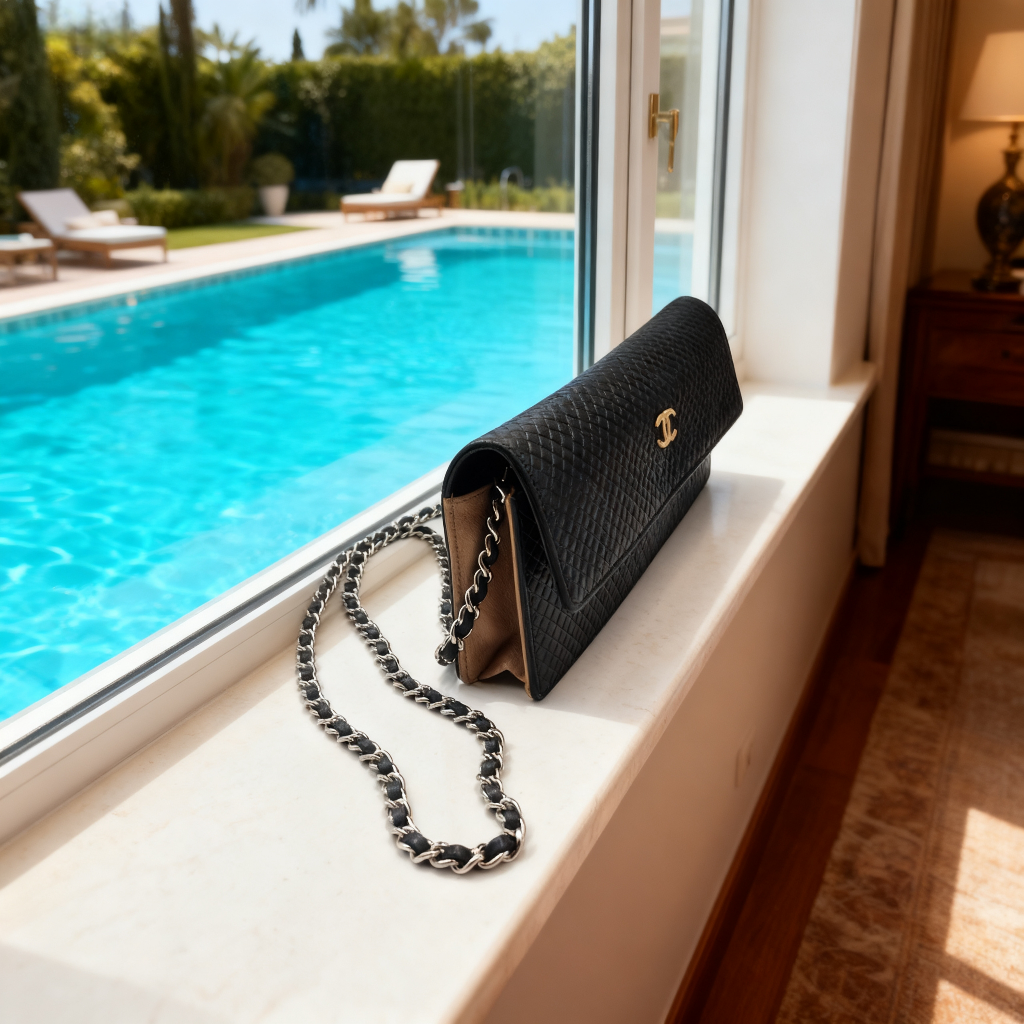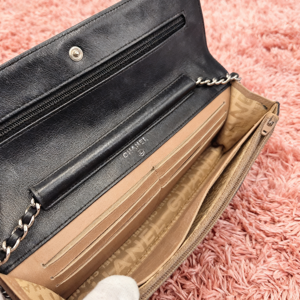 バッグと財布が一体化した便利なチェーンウォレット☆ 全体に細かなロゴやキルティングのエンボス加工が施されています。 斜めがけが出来るバッグのようなチェーンタイプで、スマートフォンなどを収納できるスリムな形状が特徴です。